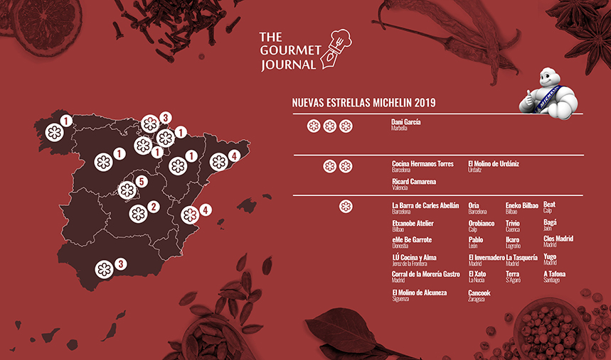 ABaC, Barcelona – chef Jordi CruzAkelarre, San Sebastián – chef Pedro SubijanaAponiente, El Puerto de Santa María (Cádiz) – chef Ángel LeónArzak, San Sebastián – chefs Eva Arzak y Juan Mari ArzakAzurmendi, Larrabetzu (Vizcaya) – chef Eneko AtxaDani García, Málaga – chef Dani GarcíaDiverXO, Madrid – chef Dabiz MuñozEl Celler de Can Roca, Girona – chefs Joan Roca, Josep Roca y Jordi RocaLasarte, Barcelona – chef Paolo CasagrandeMartín Berasategui, Lasarte (Guipúzcoa) – chef Martín BerasateguiQuique Dacosta, Dénia (Alicante) – chef Quique Dacosta